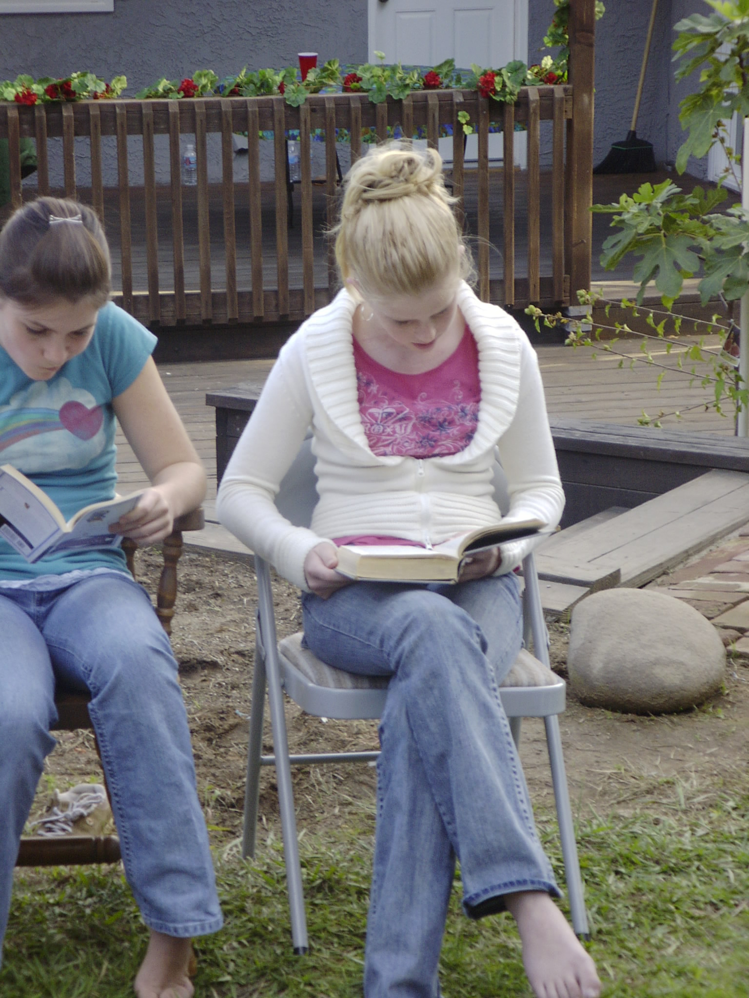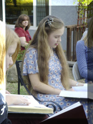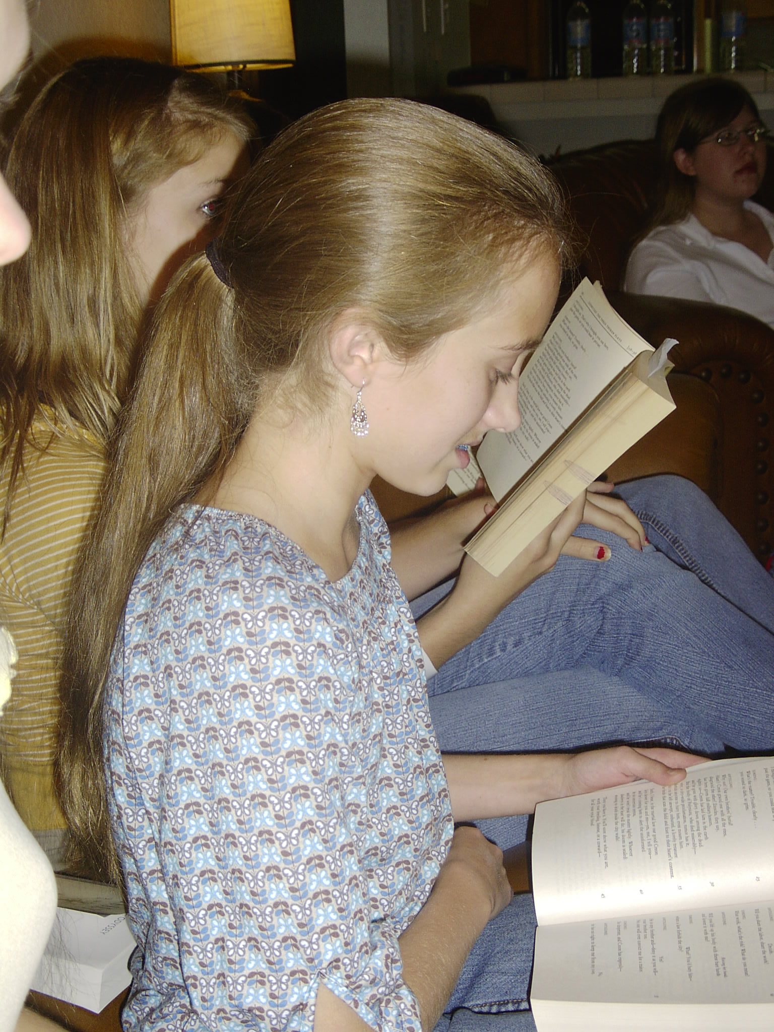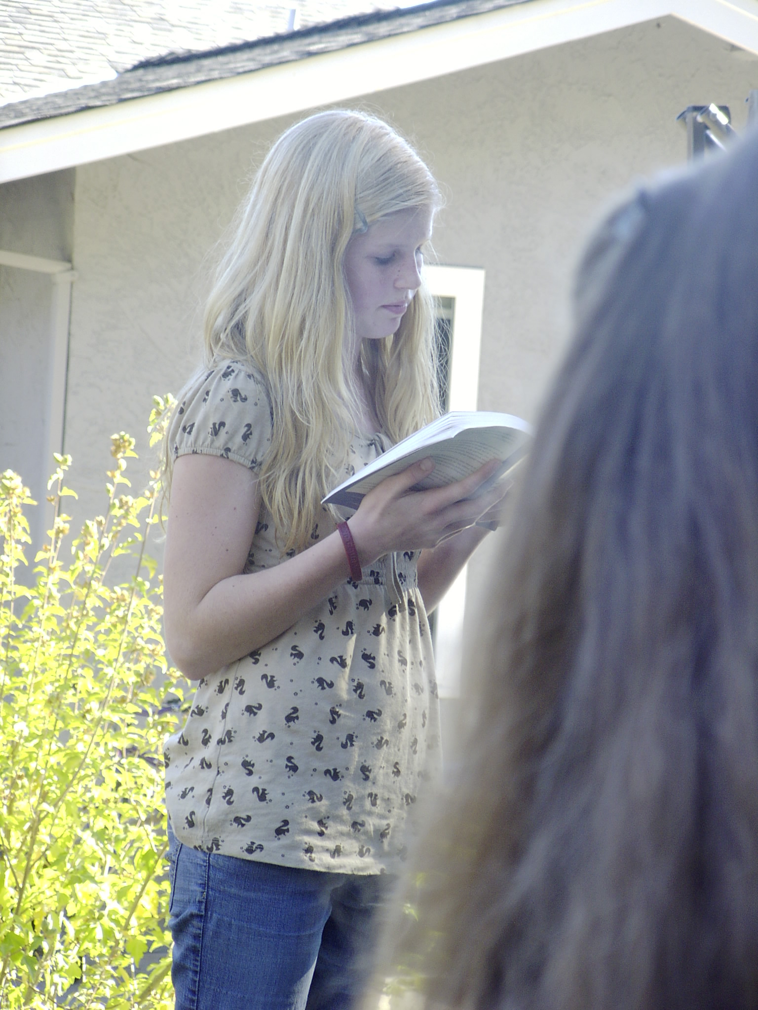 At this time, we all were given two hours for lunch, so we each went different ways, some going to practice their parts for the Antigone reading later that day, or preparing for the Homeric read-a-thon. The boys, as usual, dashed outside to play tag, capture the flag, or jump on the trampoline. During the break, Mr. Hinrichs and Cassie Atkinson grabbed their musical instruments and serenaded whomever was outside talking, Mr. H on his infamous banjo, and Cassie on the guitar.