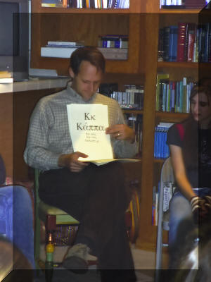 At last it was time for the read-a-thon! The epic tale of Odysseus’ rough trip home to Ithaca was read through certain chapters, capturing the listeners’ interest and entertaining those playing nearby. Mr. Hinrichs read chapter one, introducing the story to us. Kaitlyn Henning depicted Odysseus’ troubles traveling through the land of the Lotus-Eaters and the Cyclops in chapter nine. I described the trial of the bow, once Odysseus had landed upon his homeland, in chapter 21. Hannah Fenn took up the tale at chapter 24, when Odysseus is reunited with Penelope, his wife. Though it was a great reading, we had to cut the chapters short and allow Mr. Hinrichs to summarize the rest in order to make time for the Antigone play which immediately followed.