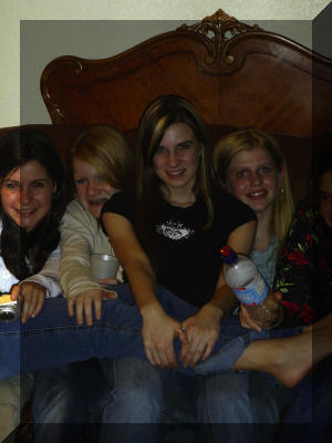 Dinner came next, as well as a chance to stretch and run around to let out our pent-up energy. We played basketball, escaped a tangle of arms and legs in the game The Knot, jumped on the trampoline, chased each other around, and otherwise wore ourselves out. It was then that Audrey, Emily and Rachel Uhland made their grand entrance! Just in time for the dancing.