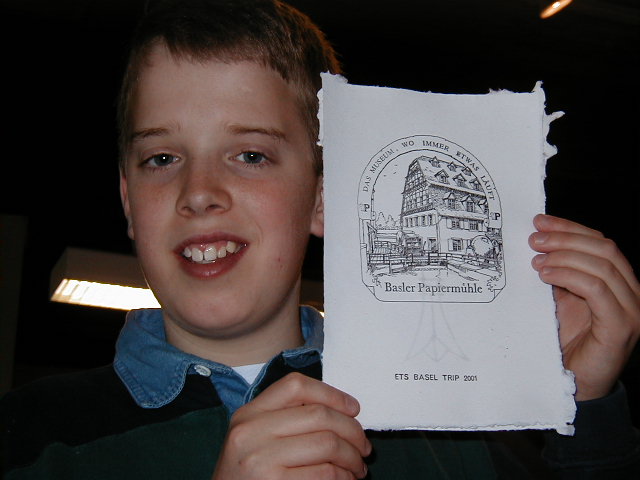 We began the day touring Lorrach where we are staying. After recovering Brooks and Mr. Popwell, who lost the group in the Marktplatz (Marketplace), we all hopped on the tram and headed for Basel. In Basel everyone gazed at all the beautiful window displays. Our favorites were the chocolate, pastries, and bread. When we arrived at the Marktplatz each person ordered ingredients for lunch at the many stands vendors had set up. Most meals consisted of Bratwurst, breads, strawberries, cheeses and meats. After lunch we went to an antique paper mill. Each person learned how to make paper, to use a printing press, and to use a type set. Then each person used the skills to create his own paper. When we completed the long walk home, we ate a traditional meal of breads, jellies, meats, and cheeses. We ate quickly, so that we could attend the St. Matthew’s Passion in Basel. This enchanting work of Bach was extraordinary. Though we were exhausted, we began translating the four-hour German work into English. To end the day everyone went for Eis (ice cream). The start of this trip has been filled with many adventures and laughs, which I hope will continue until we return.