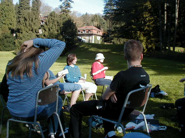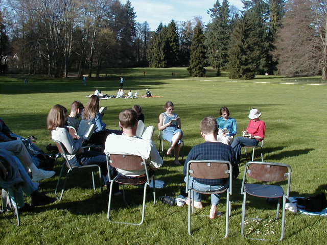 Sunday we went to church, amazingly original thing to do isn’t it? The chapel we went to was a beautiful building. It was a creamy white on the inside with very high ceilings. The ceiling was, in part, stained glass. The sermon was preached by a gentleman who works for Novartis, the pharmaceutical plant. To the right of the chapel there was a beautiful garden with trees and flowers and two visiting ducks in a pond. We wanted to get picnic items for dinner and future lunches so we caught the tram to the Basel SBB, the train station. A grocery store, the Migros, was a good place to get food, and was the only place open. Mr. Hinrichs had planned on eating lunch at the hotel, but when we got back we were too late. So instead we walked to the Wenge Hof, which is now a park. The entrance was quite impressive with wrought iron gates and huge gold statues of two deer. There were rain spouts in the shape of dragons and big beautiful grassy spots. We found a place to set up camp and proceeded to eat lunch. Afterwards Jonathan and Kit learned how to say, “May we play with you?” and played a game of soccer with some Swiss. Mr. Popwell also caught the spirit of sports and played some baseball. When everyone was rested, or tired out, we took out Hamlet and assigned parts.
