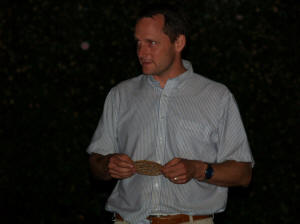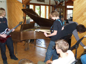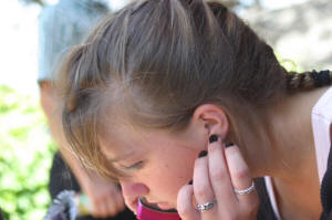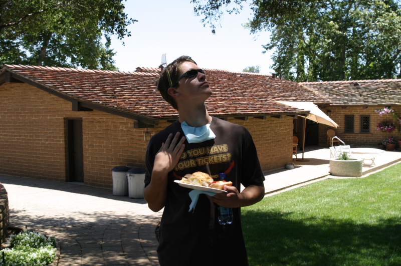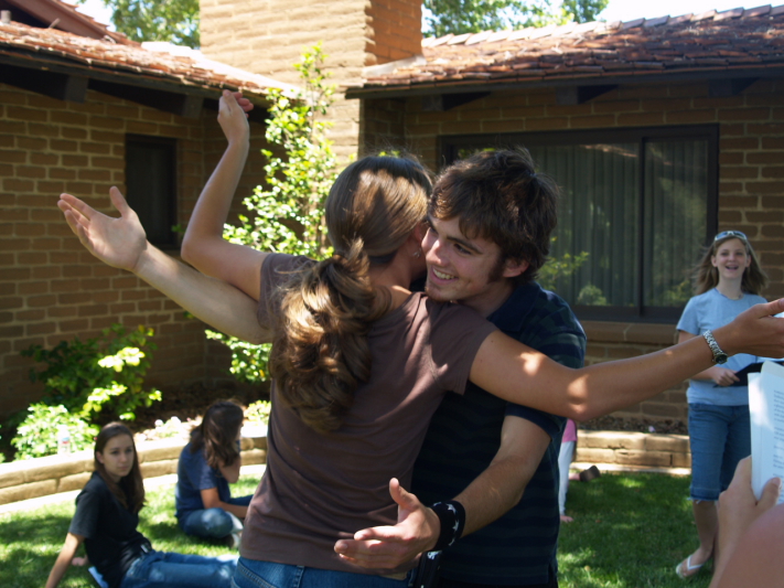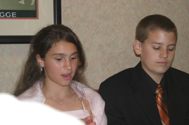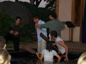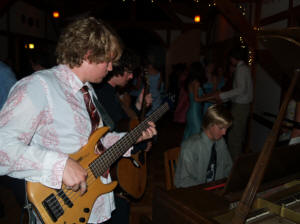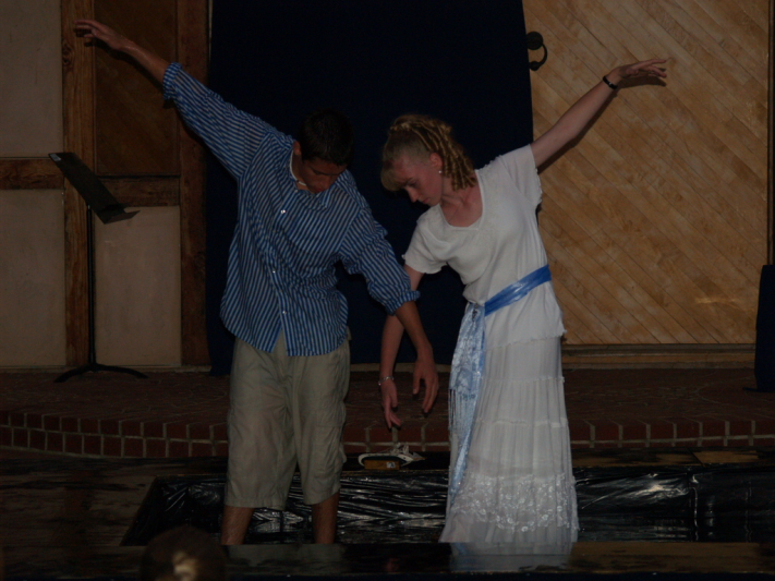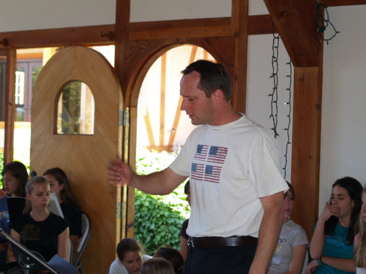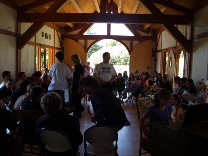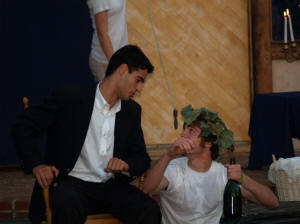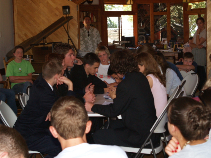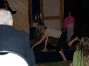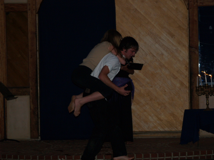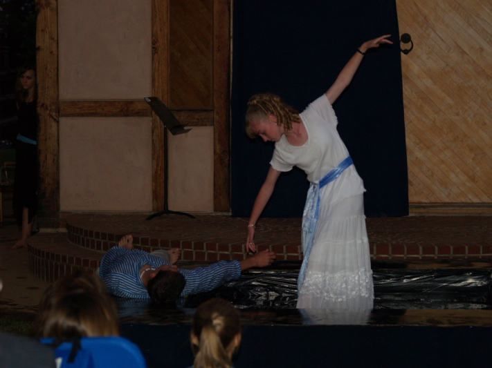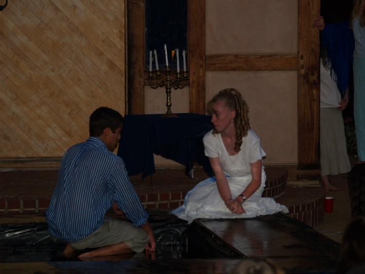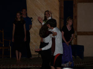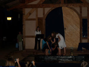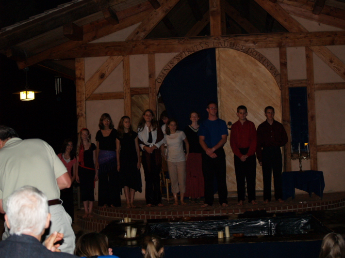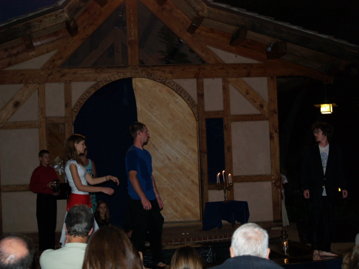 Greetings were said, hugs given, half-forgotten faces remembered, and a hint of anticipation filled the air---thus began the 2006 Summer Fling! While old friends chatted away, Mr. And Mrs. Hinrichs made their rounds, personally greeting all the students before the “Official Fling Introduction”. After this, we played the name game, which always proves to be very amusing. Rachelle Kampen then presented her GBT V paper, Christ in the Gallery of Images. After profitably engaging our minds for an hour with this, we broke for a wonderful potluck lunch, which was prepared by our lovely mothers. After lunch, the actors in the Metamorphosis practiced for the play, while the other students either walked the grounds (mostly the girls) or viciously played “Ultimate Frisbee” (mostly the guys). At 2:00, the students wandered back to The Hall for the Homeric Read-a-thon where Mr. H, Daniel Parker, Grace Marie Lambert, Jonathan Keller and Frances Pedraza fervently sang of “the rage of Achilles” presented in Homer’s Iliad. Unfortunately, due to the untamable time, we could not finish the Iliad, and were only able to make it through the first five books. Afterwards we sang through the ETS Song Book with Dies Irae played by Rachelle Kampen and then Zach O’Brien. We had separate dinners and returned at 8:00 to watch the film Heaven and discuss it. One of the actors in the film, Giovanni Ribisi, was the Near’s second cousin…unfortunately, he was unable to make it to the movie night J.