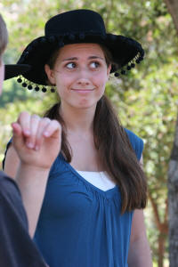 Mr. Hinrichs started with introductions and greetings, and gave everyone specific instructions regarding such things as tempting fruit and backyard boundaries, as well as the codes of behavior for the rest of the week. Then after we took a walk around the Hinrichs’ grounds for the grand tour we started with our first event—a bit of a nerve-racking one: the name game. We gathered in a huge circle that took up almost the entire croquet lawn. Evan. Evan Evangeline. Evan Evaneline Josh. Evan Evangeline Josh…(etc) all the way around the entire circle. When we had finished, Mr. Hinrichs led everyone in a few rounds of the Greek Alphabet song, “Alfa, Bhta...” which we would need to know in order to eat lunch, and then we all squeezed on to the front steps of the hall for the group picture. Next, it was time to listen to the first paper presentation of the Fling: “The Divine Ultimatum” by Matt Nunez regarding the controversial topic of predestination and free will in salvation. Rapid, intense questioning was still in full swing by the time Mr. Hinrichs announced that it was lunchtime. We were met with tables brimming full of delicious food. (If you said your Greek correctly, that is. Otherwise, not quite so brimming…) During lunch everyone went their own way: playing sports, chatting on the lawn, or, in my case—along with about twenty others—practicing scenes for the Fling play. Our practice was interrupted for a short time in order to announce Kylie Henson the first place winner for the baking conquiz. At around 2:00, Mr. Hinrichs called us all in for singing practice, and we worked on the old favorites: Dies Irae, Fairest Lord Jesus, Jubilate Deo etc, and for an hour the sounds of beautiful music and voices drifted from the hall. Soon, other, different sounds were filling the hall—the sounds of voices reasoning, persuading, questioning, and dissenting—in short, a debate. The topic was a familiar one to us from our GBT 1 readings: “Creon’s actions regarding the body of Polynices were wholly unjust and indicative of the tyrannical abuse of his office.” We were split into Pros and Cons and were told to form arguments that would hopefully persuade the GBT V “jury” to vote in our favor. There were speeches made on both sides and then the “stand and shoot” which soon became very animated. Finally, we sat quietly and watched the GBT V jury discuss the arguments put forward, vote, discuss more, vote, discuss even more and vote some more, and finally, finish with a (somewhat reluctant) unanimous vote in favor of the Cons. Everyone dispersed for dinner. The last event of the day was dance practice. I can still see the last streams of golden sunlight flickering over laughing faces and stamping feet as we danced and danced; the breeze seemed to send all the oak trees around us dancing too—as if they just had to join in all that wonderful fun!