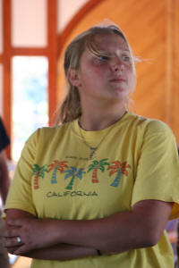 After our morning Snickers throw in which Mr. Hinrichs quizzed our memories on particulars from our readings, paper presentations began, with the general topic of “The State.” First, John Michael La Salle presented his paper, “The Purpose of Government;” next was Zach Johnson, presenting “An Imposition of the Philosophical,” and finally Abbey Cook and her paper, “The Spiritual Side of Wealth and Riches.” By the time these papers were finished, it was time to eat. The lunch line had clusters of nervous students whispering such familiar Greek phrases and meanings as “the geometer may not enter” and “know yourself.” After lunch, we had another singing session, which was followed with a new tradition, a “Contemplation of Gratitude.” Mr. Hinrichs told us that just as someone who has arrived home safe from a long and eventful journey gives thanks to God, so he wanted to give thanks. He said many things, but something that has stayed in my memory was his thanks to all of his students and their families, for their character and continued interest to learn in a such a setting that he has offered, as it is for that reason that he is able to continue to do what he does—and that otherwise, most of what GBT is would be impossible. Mr. Hinrichs was followed by his niece, Autumn, who related her college experience to us and told us of the classes she was starting as a supplement to Great Books. The next event was one that has been received with mixed emotions—the Septathalon. Namely, a sports event (“sports” is perhaps a loose definition) composed of basketball, volleyball, croquet, badminton, Lego building, interpretive dance, and garden chess. The catch is, that in front of all, and inverse to dancing, or backwards, or inside out—however you think of it—the girl must ask a guy to be her partner for this particular event, making it complete with the typical emotions of dread, embarrassment and suspense. However, at the end it is the girl who is proclaimed victorious and given the costly trophy. For this Septathalon, Kylie Henson (and Nathan Henson) claimed the victory. Finally, after dinner we spread out our blankets and chairs on the lawn and sat back to watch Lady Jane, the romantic and heroically tragic story of the young girl who was the Queen of England for only nine short days. We had discussion afterwards, and then, sleepily gathered our things, which were very wet with dew, and headed home till the next day.