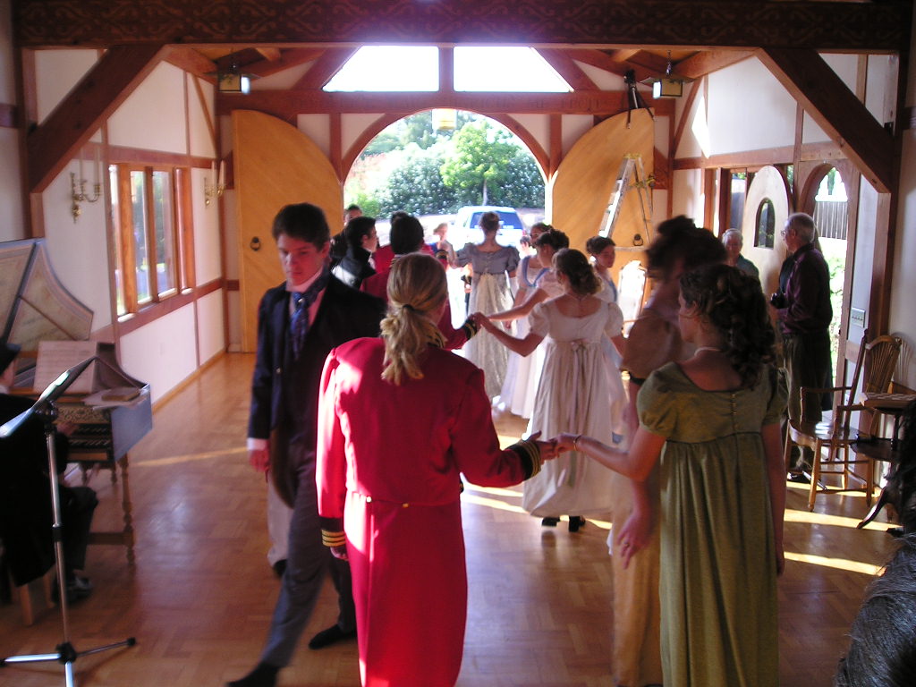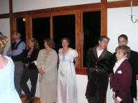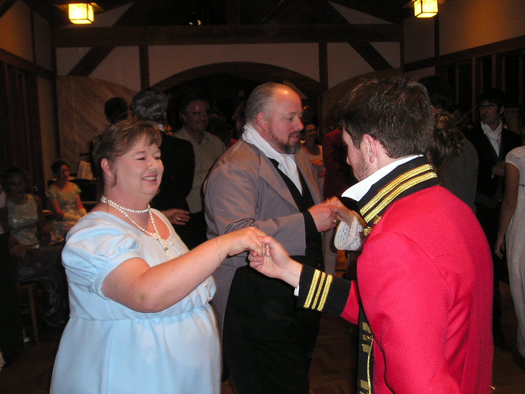 Guests and actors were brave enough to step out and dance several Regency classics such as: Shrewsbury Lasses, The Barley Mow, The Corporation and Mr. Beveridge's Maggot (the lovely dance that Elizabeth and Darcy dance and talk during in the A & E version of P & P). (Yes, we know the title of the last dance sounds rather ridiculous. It means, "Mr. Beveridge's Flight of Fancy". Doesn't that sound a bit nicer?)